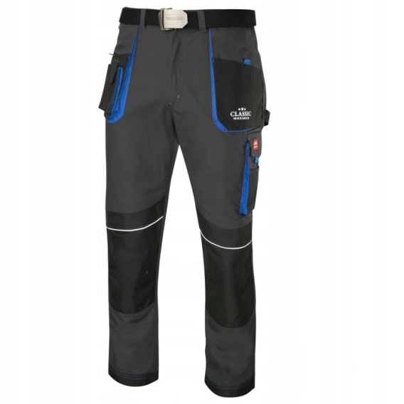 >ROZMIAR 46<</h2>Spodnie ochronne CLASSIC MAXIMUS, do pasa, o wyjątkowo atrakcyjnym wzornictwie i doskonałej funkcjonalności.Wykonane z bardzo wytrzymałej tkaniny canvas o składzie 65% poliestru i 35% bawełny o gramaturze 270 +/-10 g/m2 oraz mocnym zwartym splocie.Charakterystyka:profesjonalne szycie i estetyka wykonania,potrójne szwy oraz liczne solidne ryglówki wzmacniające miejsca szczególnie narażone na rozerwanie,elementy odblaskowe z tyłu i z przodu spodni- podnoszące bezpieczeństwo użytkownika10 funkcjonalnych kieszeni, kieszenie wzmocnione czarną tkaniną poliestrową Oxford600D,2 kieszenie kolanowe z otworem od góry na nakolanniki oraz klapką zapinaną na rzep. Nakolannik wkładany z góry. Kieszenie wzmocnione są tkaniną polyester Oxford 600D, która charakteryzuje się dużą wytrzymałością, odpornością na ścieranie i rozciąganie oraz wodoodpornością,zapinane z przodu na metalowy guzik i suwak,wygodny i praktyczny system regulacji obwodu pasa za pomocą gumki w pasie,mankiety nogawek wzmocnione wytrzymałym materiałem Oxford 600D ułatwiającym utrzymanie czystości,bardzo niska kurczliwość, nawet po wielokrotnym praniustabilność koloruMarka: Art-MasKolor: grafitowo-czarny z niebieskimi wstawkami i odblaskowymi elementamiPas nie stanowi części zestawu. Pas Professional sprzedawany jest oddzielnie.CE kat.1 EN ISO 13688:2013 -opakowanie zbiorcze 1/20
