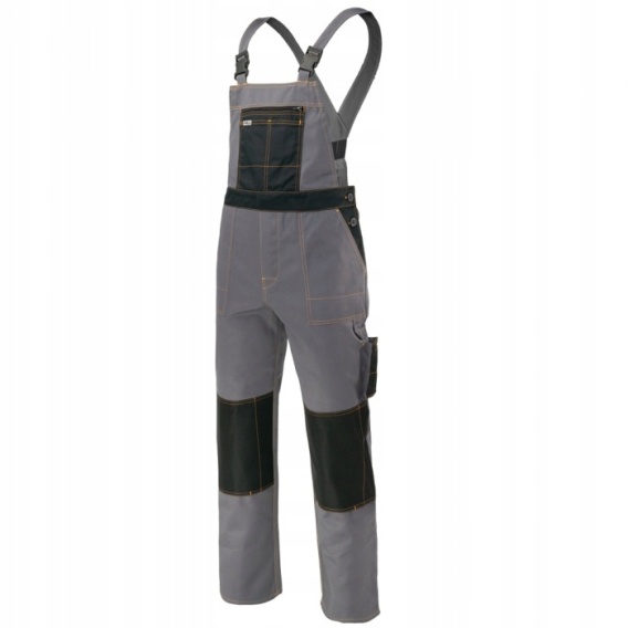 >ROZMIAR 56<</h1>Spodnie ochronne, typu ogrodniczki, wykonane z tkaniny poliestrowo - bawełnianej  (65% poliestru i 35% bawełny) o gramaturze 290 g/m2.Charakterystyka:zapinane z boku na guziki, z regulacją szerokość pasa,szelki z gumą i plastikowymi klamrami,3 kieszenie na klatce piersiowej, w tym jedna zapinana na suwak,2 kieszenie boczne poniżej pasa,kieszenie kolanowe, wzmocnione materiałem typu Oxford 600D, umożliwiające włożenie ochraniaczy na kolana,kieszeń na metrówkę na nogawce,rozporek zapinany na guziki,podwójne szwy oraz ryglówki wzmacniające dodatkowo miejsca szczególnie narażone na rozerwanie,bardzo niska kurczliwość, nawet po wielokrotnym praniu,stabilność koloru.Wygodne, niekrępujące ruchów, wykonane z wytrzymałych materiałów.CE Kat.I EN ISO 13688:2013 - opakowanie zbiorcze 1/20
