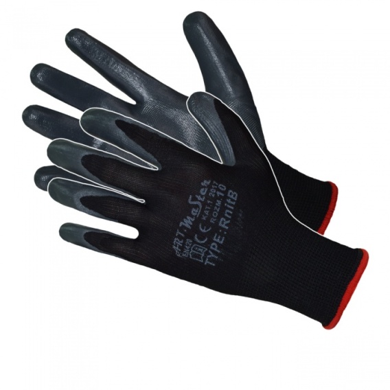 Rękawice ochronne, wykonane z dzianiny poliestrowej  w kolorze czarnym,  powlekane nitrylem w kolorze szarym, zakończone ściągaczem, bezszwowe.